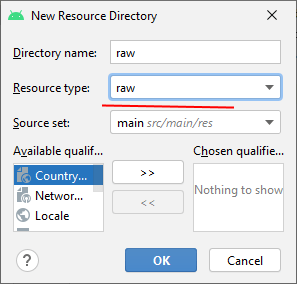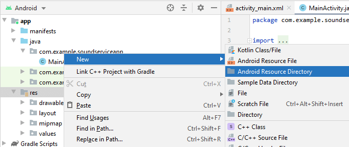 Створимо найпростіший додаток із сервісом. Наш сервіс буде відтворювати музичний файл. І спочатку додамо в проєкт у каталог res папку raw. Для цього натиснемо правою кнопкою миші на каталог res і в контекстному меню виберемо пункт New -> Android Resource Directory.
