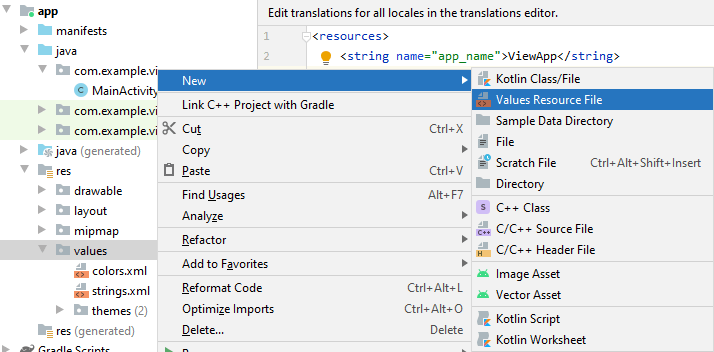 Так, натискаємо на папку res/values правою кнопкою миші та в з'явившомуся списку вибираємо пункт New -> Value Resource File: