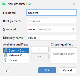 Назвемо, наприклад, headers (назва файлу довільна), а для всіх інших полів залишимо значення за замовчуванням. І в папку res/values буде додано новий файл headers.xml. Визначимо в ньому пару ресурсів: