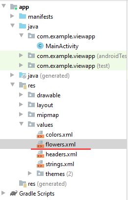 Розглянемо приклад. Додамо в папку res/values новий ресурс. Назвемо його flowers: