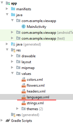 Ще одним видом строкових ресурсів є string-array або масив рядків. Наприклад, додамо в папку res/values новий файл, який назвемо languages.xml:
