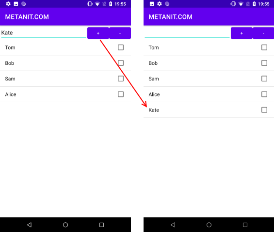 Однак, після застосування вищезазначених методів, зміни стосуватимуться лише масиву, який є джерелом даних. Щоб синхронізувати зміни з елементом ListView, потрібно викликати у адаптера метод notifyDataSetChanged().