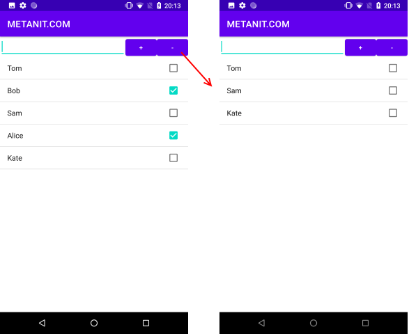При натисканні на кнопку видалення, ми проходимо по списку виділених елементів і викликаємо для кожного з них метод adapter.remove().