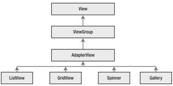 Android представляє широку палітру елементів, які представляють списки. Усі вони є спадкоємцями класу android.widget.AdapterView. Це такі віджети як ListView, GridView, Spinner. Вони можуть виступати контейнерами для інших елементів керування.