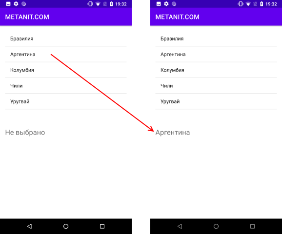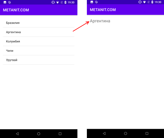 У цьому випадку ми отримуємо фрагмент DetailFragment за допомогою методу getSupportFragmentManager() і викликаємо його метод setSelectedItem(). Як аргумент у цей метод передається строкове значення, передане через Intent.