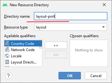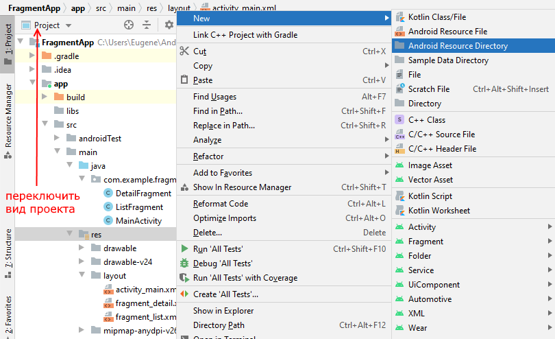 Отже, створимо в проекті в папці res, де зберігаються всі ресурси, підкаталог layout-port, який буде зберігати файли інтерфейсу для портретної орієнтації. Для цього перемкнемося до повного вигляду проекту. Натиснемо на папку res правою кнопкою миші і в контекстному меню виберемо New -> Android Resource Directory: