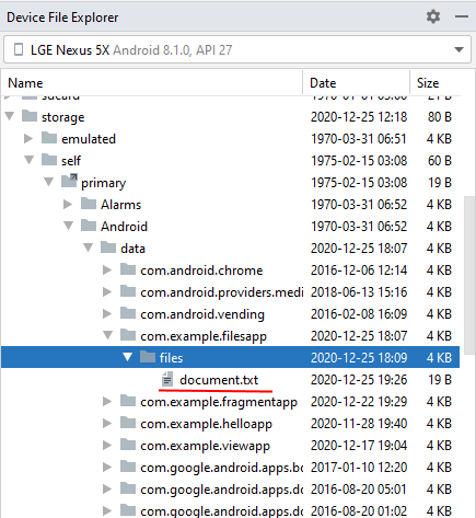 І після операції запису на смартфоні через Device File Explorer ми зможемо побачити створений файл у папці storage/self/primary/Android/data/[назва_пакета]/files: