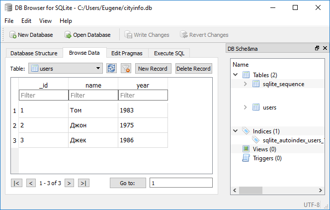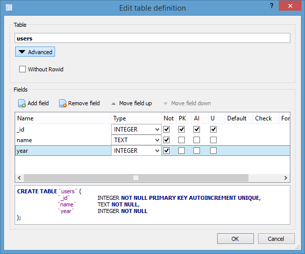 Як видно на скріншоті, я визначаю таблицю users із трьома полями: _id, name, age. Загальна команда на створення таблиці буде такою: