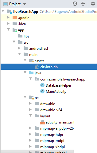 І також додамо в проєкт в Android Studio папку assets, а в папку assets - щойно створену базу даних: