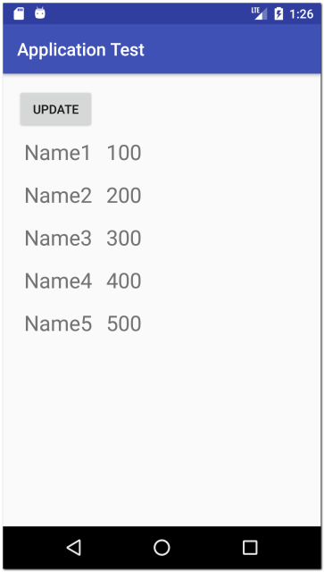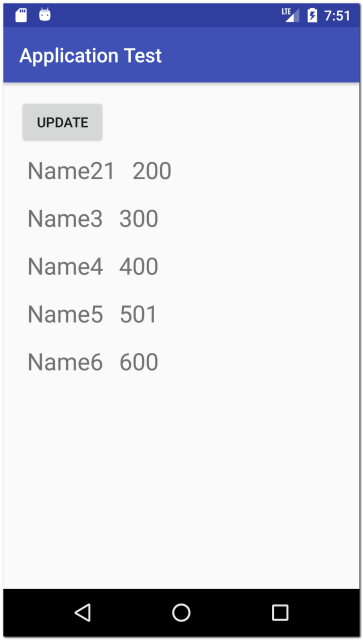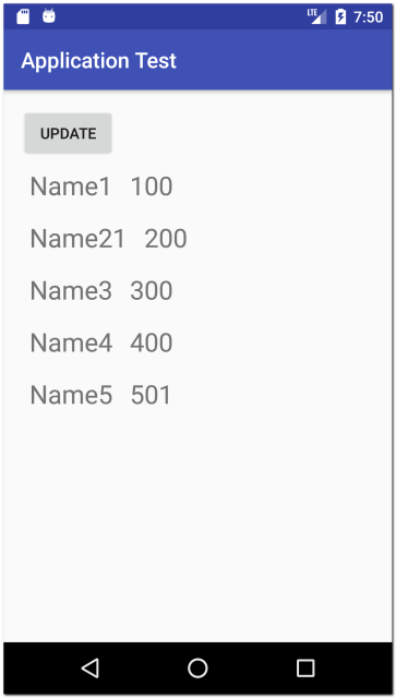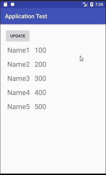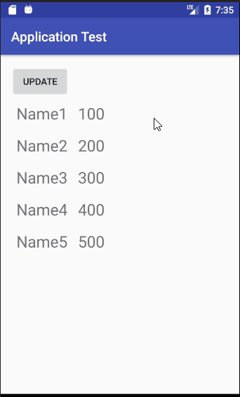 Для початку переконаємося, що під час використання методу notifyDataSetChanged для всіх рядків буде виконано біндинг. Після натискання на кнопку Update будемо оновлювати дані в списку: